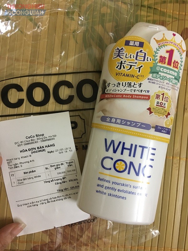 Hóa đơn mua hàng và sản phẩm mua tại cửa hàng mỹ phẩm Co Co Shop