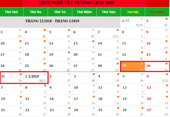 Theo văn bản số 6519/VPCP-KGVX của Văn phòng Chính phủ, Thủ tướng Nguyễn Xuân Phúc đã đồng ý với đề nghị của Bộ Lao động - Thương binh và Xã hội tại văn bản số 30/Ttr-LĐTBXH về việc nghỉ lễ, Tết năm 2019, trong đó Lịch nghỉ Tết Dương lịch 2019 là 4 ngày, từ thứ Hai (ngày 31/12/2018) đến hết thứ Ba (ngày 01/01/2019), đi làm bù vào thứ Bảy (ngày 05/01/2019).